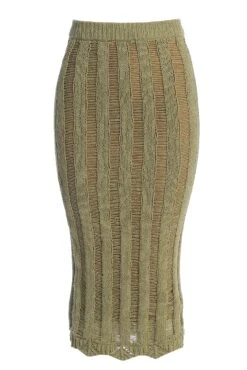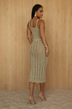 Luxuriate under the sun with our Moss Good Form Midi Skirt. This pencil silhouette midi skirt is featured in a distressed crochet fabric with an elastic waistband and beige lining interior. Pair with our