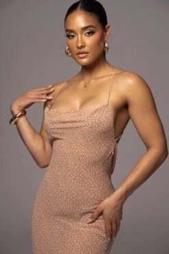 Our new Beige Good Luck Charm Maxi Dress brings a dreamy feel to Summer days in a fitted maxi design featuring a subtle floral print with adjustable back straps, a side zipper closure, and low cowl back. No stretch. Single lined.