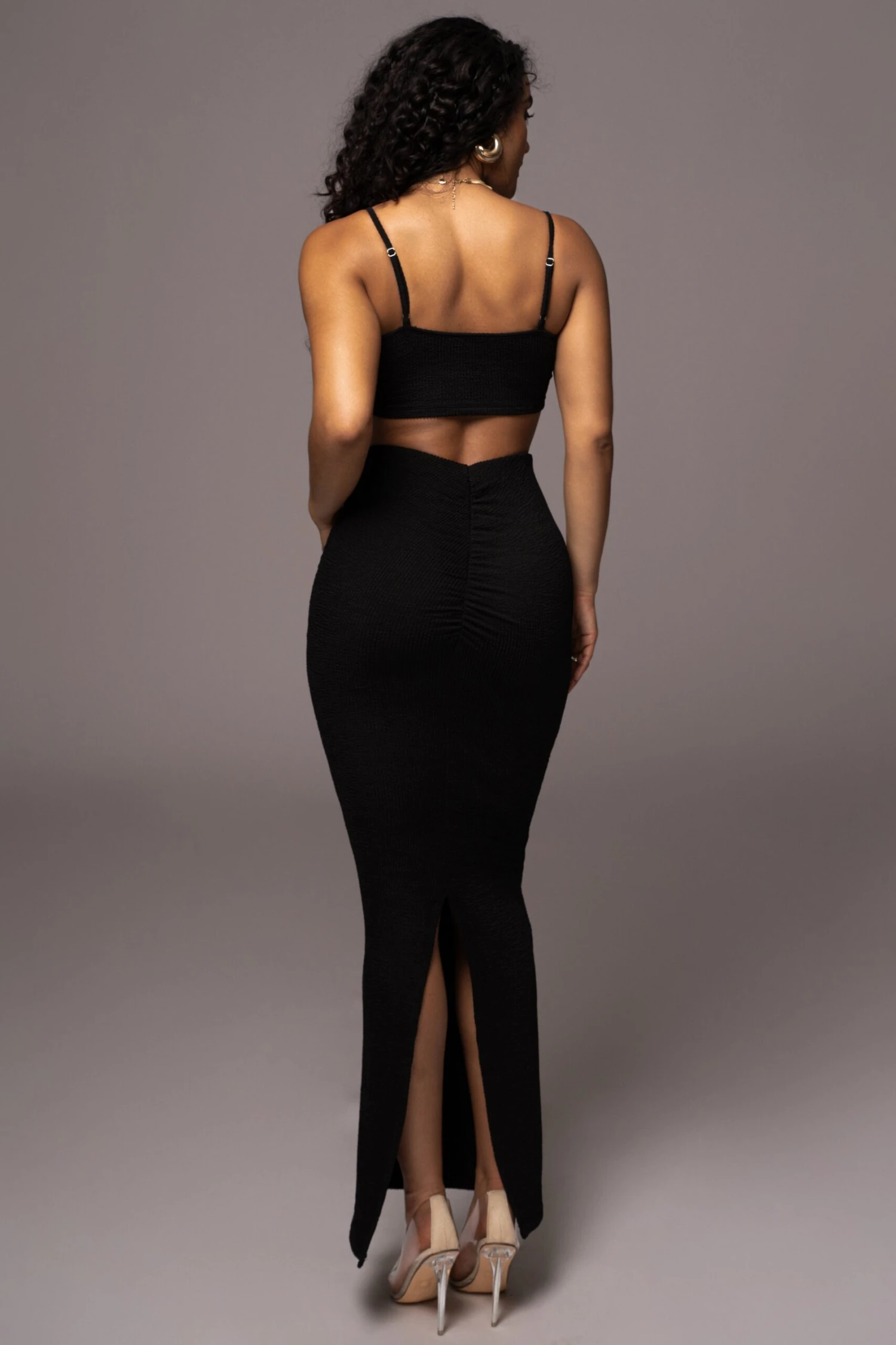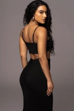 Our Black Fiji 2-Piece Skirt Set was made for Summer. This captivating two piece skirt set is designed in a smocked inspired fabric providing breathable comfort throughout the seasons. Featuring a bralette style top with adjustable shoulder straps while the matching skirt features an elastic waistband with fitted silhouette, back slit hem, and maxi hem. Single lined. Stretchy. Sold as set.