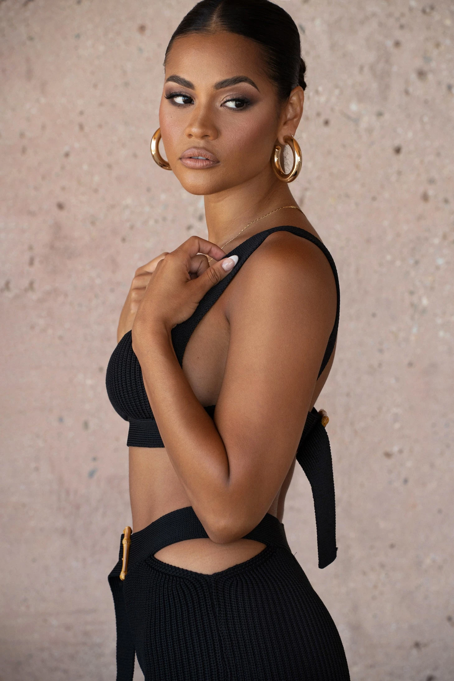 The Noir Nikole Ribbed Skirt Set is a match made in paradise! This form fitting skirt set features a lovely crop top cut with a squared neckline, fixed shoulder straps, and an open back detailing a squared bamboo buckle. The matching maxi skirt comes with a pencil silhouette, cut-out sides at the hip, and a squared bamboo buckle. Stretchy. Split back hem. Sold as set.