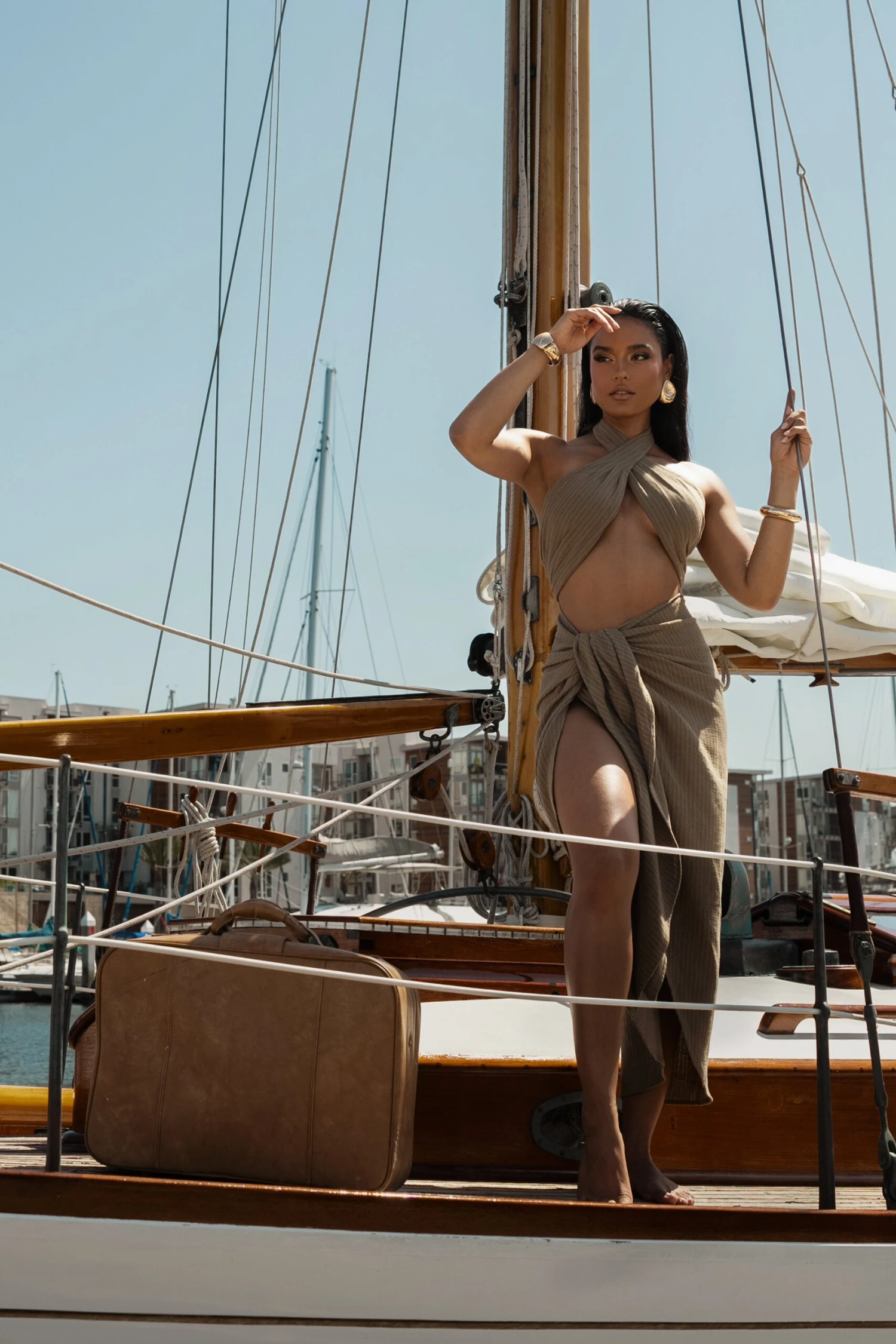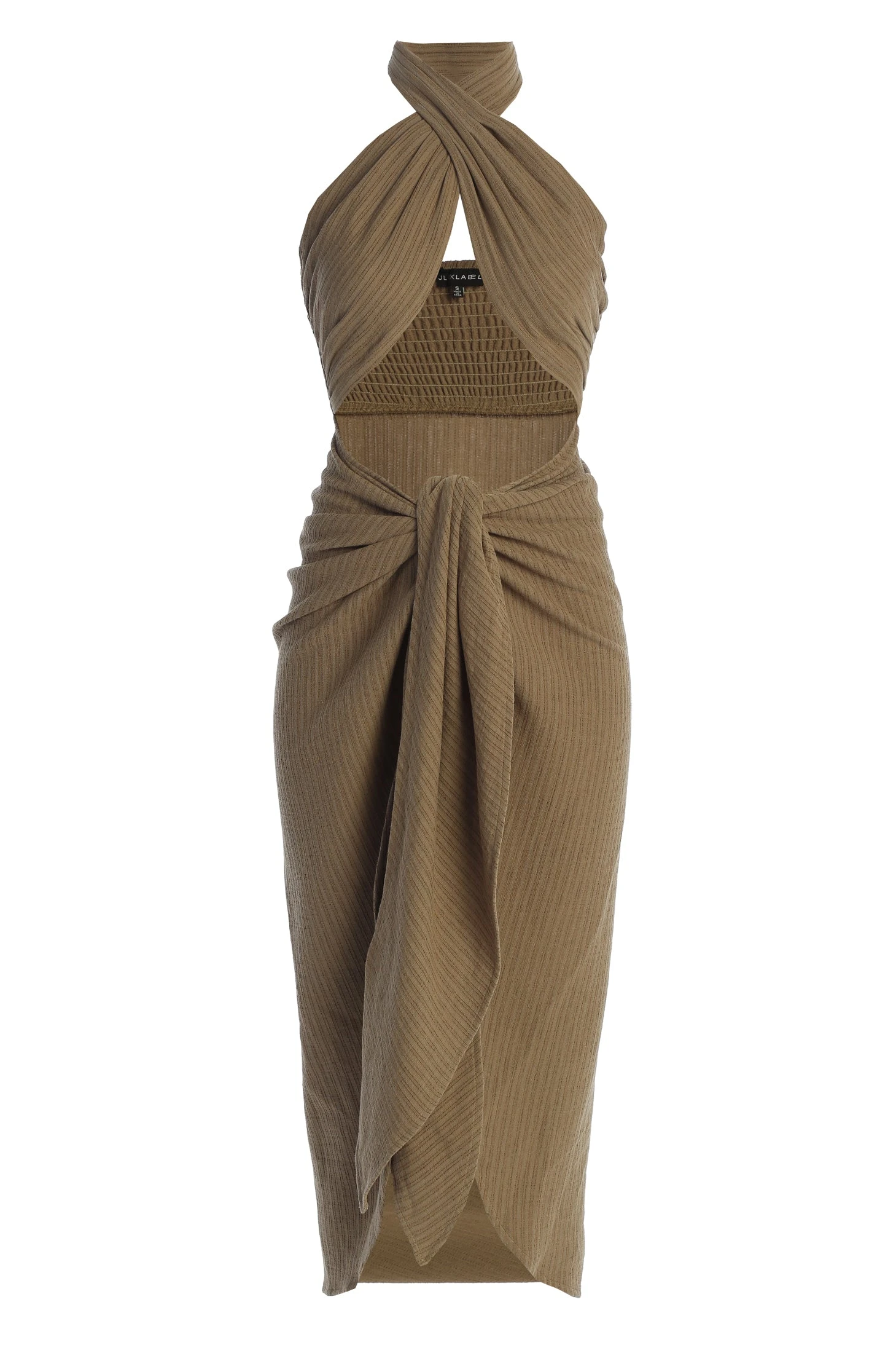 Channel the goddess in you with our Brown Linen Sahara Dress. This appealing drape design features a crossover halter-neck with center cutout and a captivating side slit with wrap front ties draping down the middle. Designed in double lined linen fabric with a smocked back for a flexible fit. Some stretch.