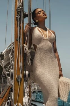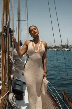 Explore new waters in our Buttercream Serenity Cutout Midi Dress. Crafted in soft crochet knit, this fitted midi dress features a halter neckline with neck tie closures, stylish front straps, and waist cutouts. Stretchy.