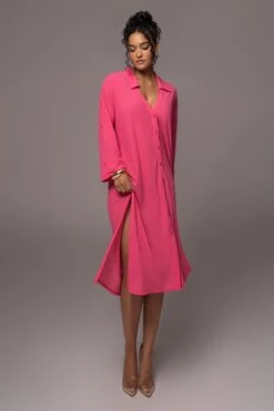 Take high summer style to the next level with our Fuchsia Sunlight Crinkled Skirt Set. This two piece set features a long sleeve top with surplice design, a collar neckline, and roll tab cuffs. The matching skirt features a wrap style design with midi length hem. Crafted of a breathable material, this summer set is the perfect cover up piece! Wear together or separate, the style possibilities are endless. Single lined with stretch. Sold as set.