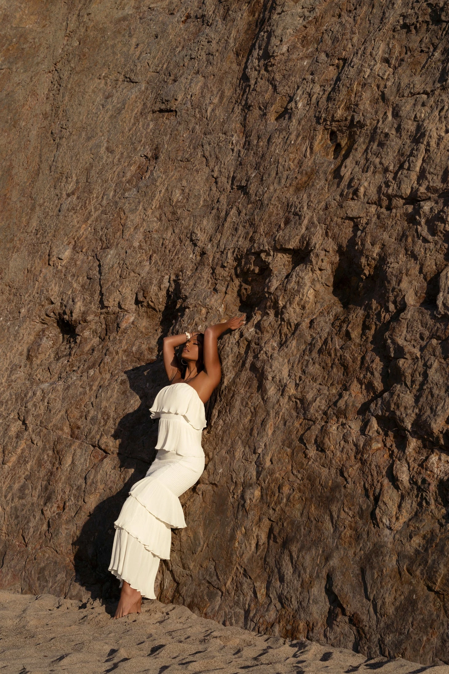 EXCLUSIVELY DESIGNED BY US FOR YOU. Perfection is an understatement when dressed in the IVORY CASA BLANCA RUFFLE DRESS. This lovely maxi dress showcases a strapless neckline with ruffle trim, a smocked lower waist, and flattering ruffled tiers throughout. Interior lining. Slip-on style. Stretchy.