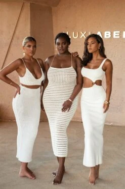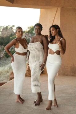 The Ivory Time After Time Dress is the definition of midsummer glamour! Showcasing a squared neckline with fixed shoulder straps, a trendy cut-out at the waist with tortoiseshell ring, and a center-back slit located at the lower hem. Designed in a ribbed knit fabric for a touch of texture. Stretchy.