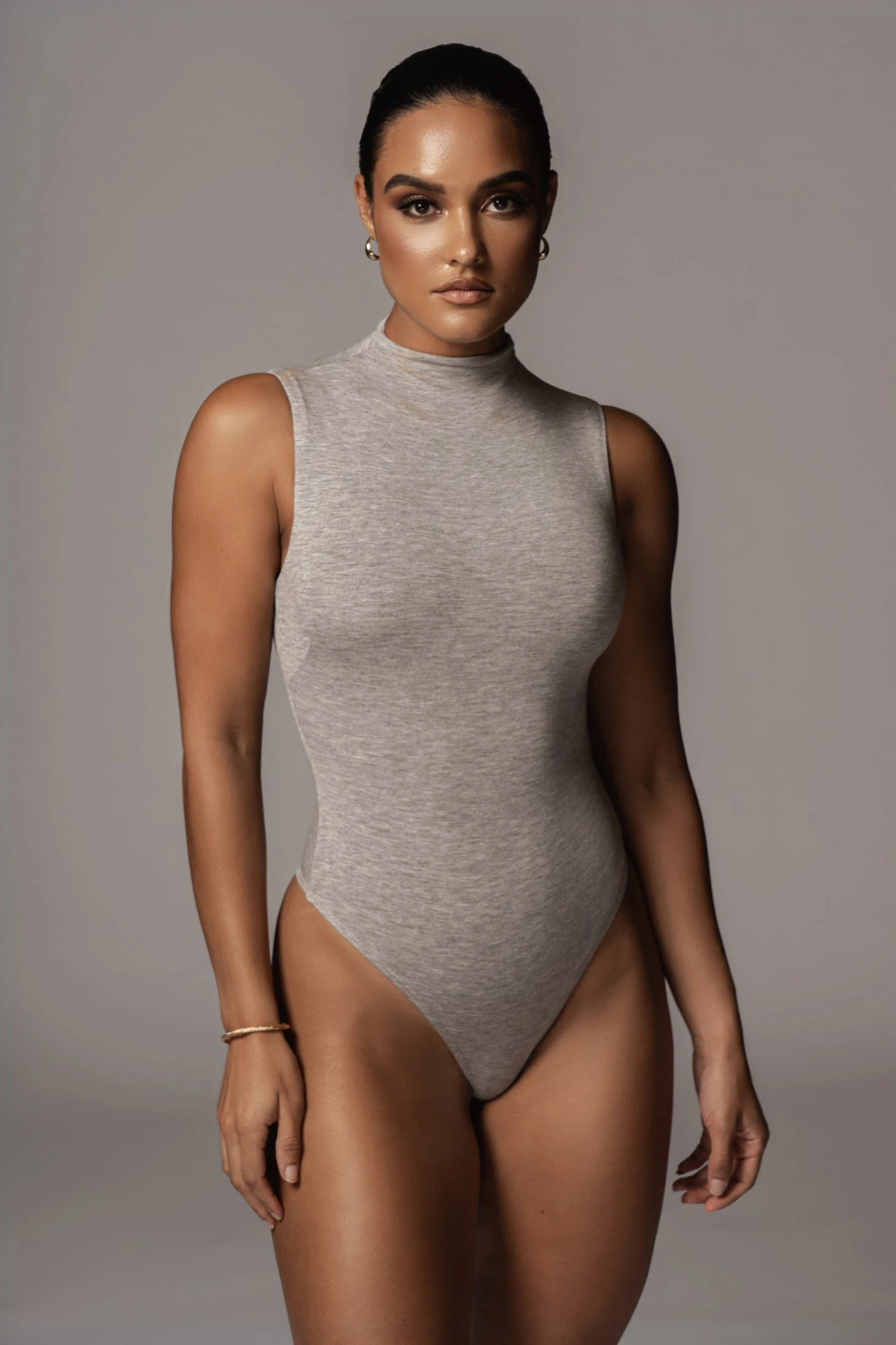 EXCLUSIVELY DESIGNED BY US FOR YOU. The must have transition piece has arrived. Our JLUXBASIXÂ GREYÂ CIELA HIGH NECK BODYSUIT is a chic ultra soft bodysuit constructed in our signature Jluxbasix double lined fabric and features a high neckline, sleeveless shoulders, and a thong bottom with snap button closure. This stunning bodysuit compliments and completes any outfit for a minimalist yet eye-catching look! Stretchy.