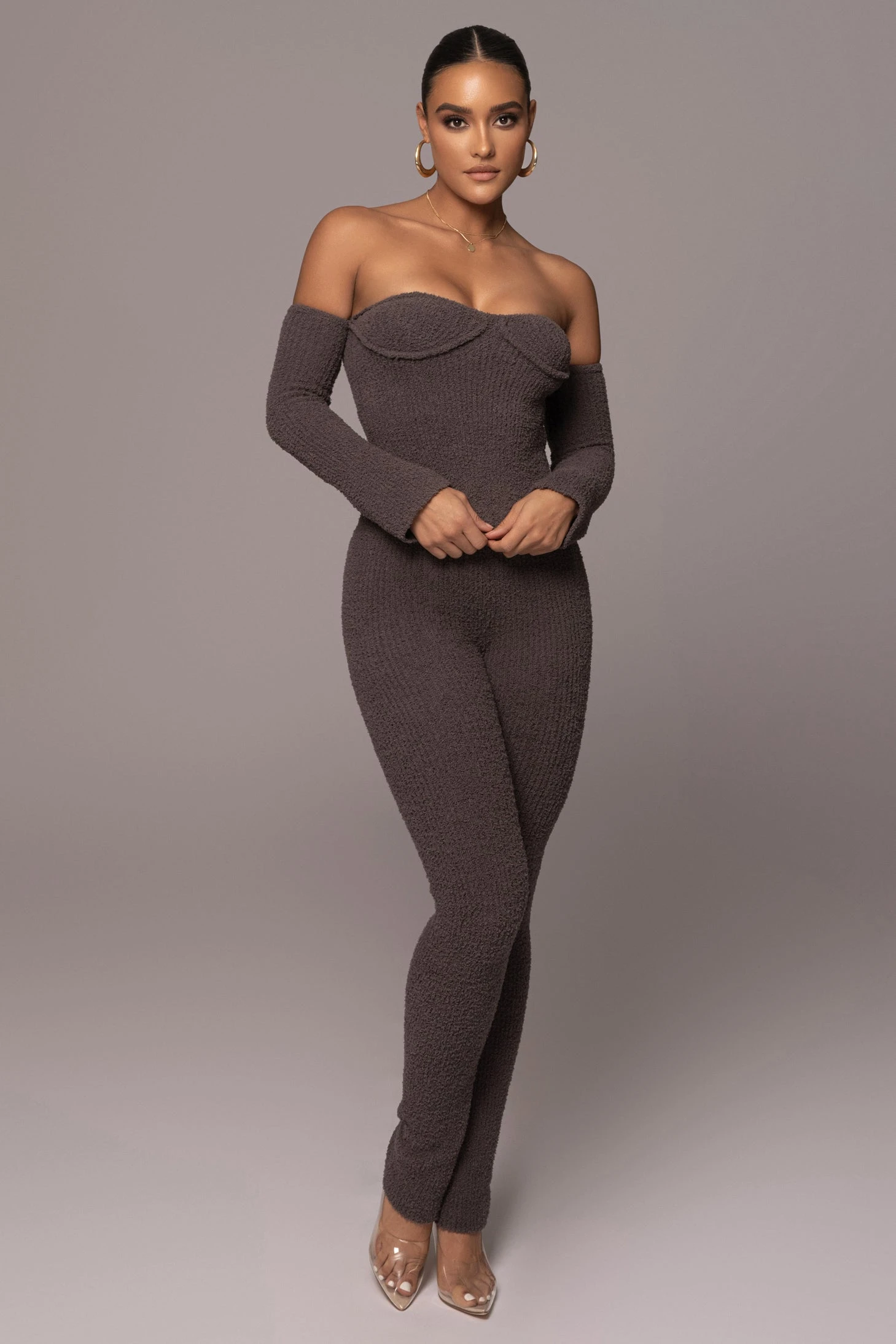 Sleek yet so comfy in our Midnight Grey Off The Record Plush Set. This ultra-soft pant set is crafted in a ribbed plush fabrication and features an off-shoulder top with long sleeves and split side hems. The matching pants are topped with an elastic waistband and fitted hems. Stretchy. Sold as set.