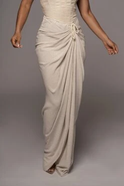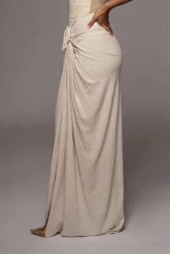 Draped to perfection proving life’s better in linen with our Natural Noelia Linen Slit Skirt. Crafted in a fresh linen material, this maxi skirt features a drape design with a stylish rope drawstring and a slit on the side. Hidden side zipper for closure. Pair with our