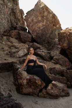 Giving you more of what you want, we’ve taken our best seller the Tory Two Piece Set and re-designed it in knit fabric for a textured element. The Noir Arya Two Piece Set provides stylish comfort featuring a stunning bandeau style top with tie front design. The matching pants come with a high waist and wide legs. Wear together or separate, this versatile two piece set can be effortlessly mixed and matched! Double-lined. Stretchy. Sold as set.