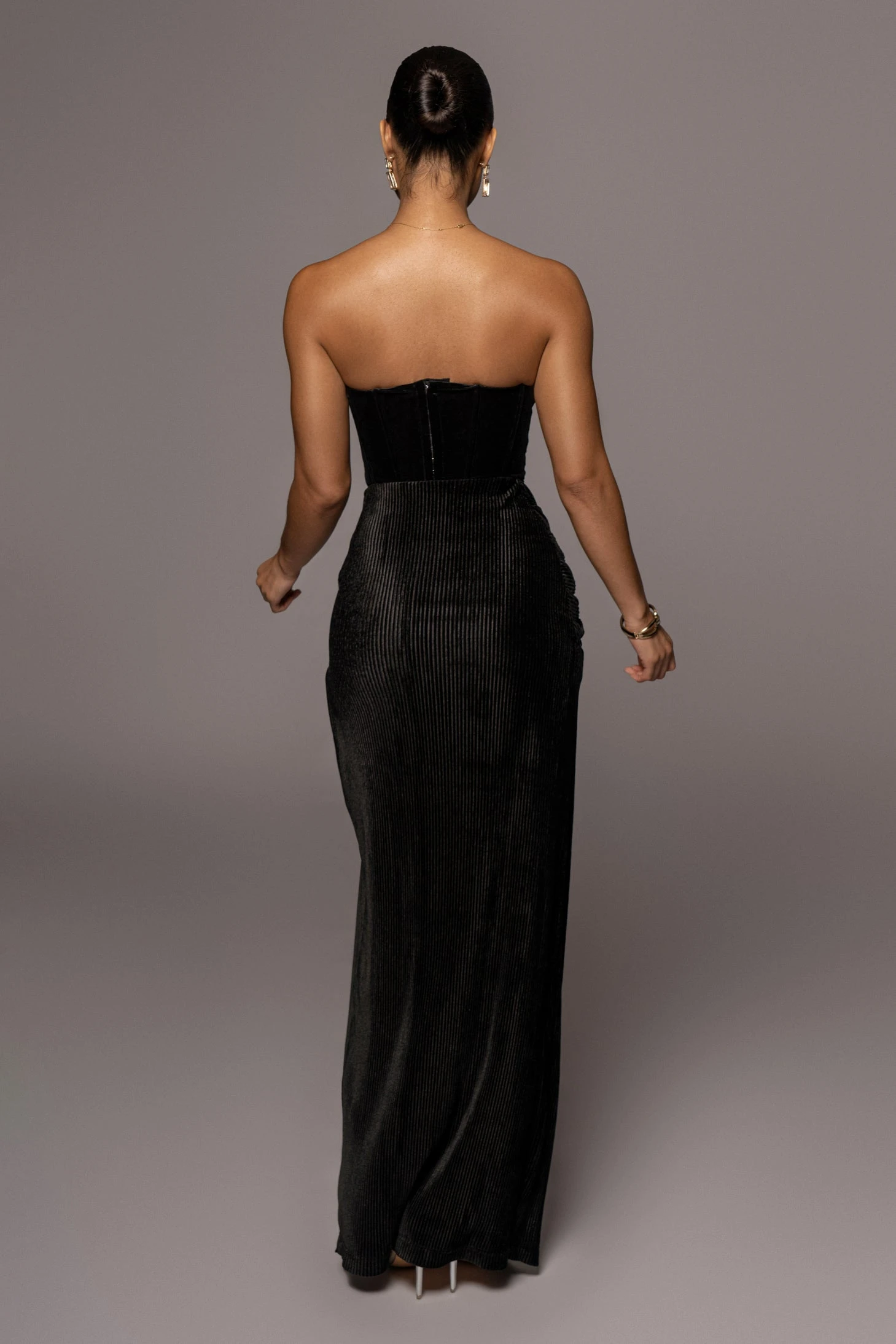 EXCLUSIVELY DESIGNED BY US FOR YOU. Get ready for endless compliments in our NOIR CITY LIGHTS CORSET TOP! This stunning velvet corset features a round neckline with pointed details, padded cups, and a boned bodice with trendy hook and eye back closures. This dreamy top is complete with grip silicone gel at the bust for a secure hold. Stretchy.