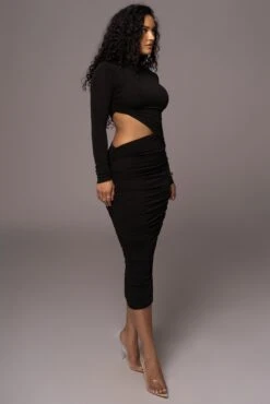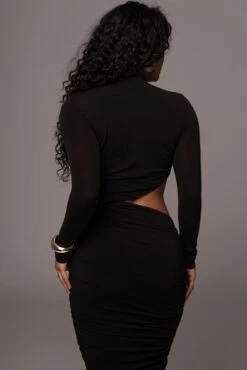 Introducing our Noir Clear Skies Mock Neck Dress – an embodiment of refined elegance. This versatile midi dress features a mock neckline, long sleeves arms, and a stylish asymmetrical cutout located towards the right waist. Flattering ruching throughout gracefully elevates this piece with texture. Stretchy. Double-lined.