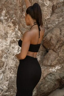 Sweet and playful in our Noir Lana Smocked Skirt Set. This captivating skirt set is designed in a fully smocked fabric and features a stunning crop top with o-ring detail and adjustable neck ties. The matching skirt features a pencil silhouette with midi length and a lettuce trim hem. Stretchy. Sold as set.