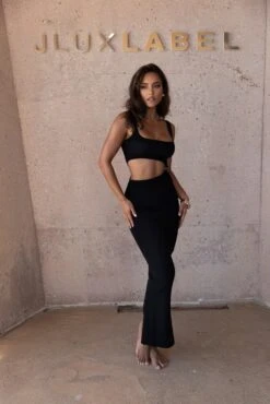 The Black Time After Time Dress is the definition of midsummer glamour! Showcasing a squared neckline with fixed shoulder straps, a trendy cut-out at the waist with tortoiseshell ring, and a center-back slit located at the lower hem. Designed in a ribbed knit fabric for a touch of texture. Stretchy.