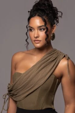 Live effortlessly elegant this summer in our Olive New Obsession Draped Top. Crafted from premium materials, this statement piece features a sweetheart neckline with one shoulder design detailing a graceful drape for an unmistakable touch of sophistication. The built-in corset and boning provide superior structure and a sensational fit. The draped piece is removable for 2 looks in one. Pair with our