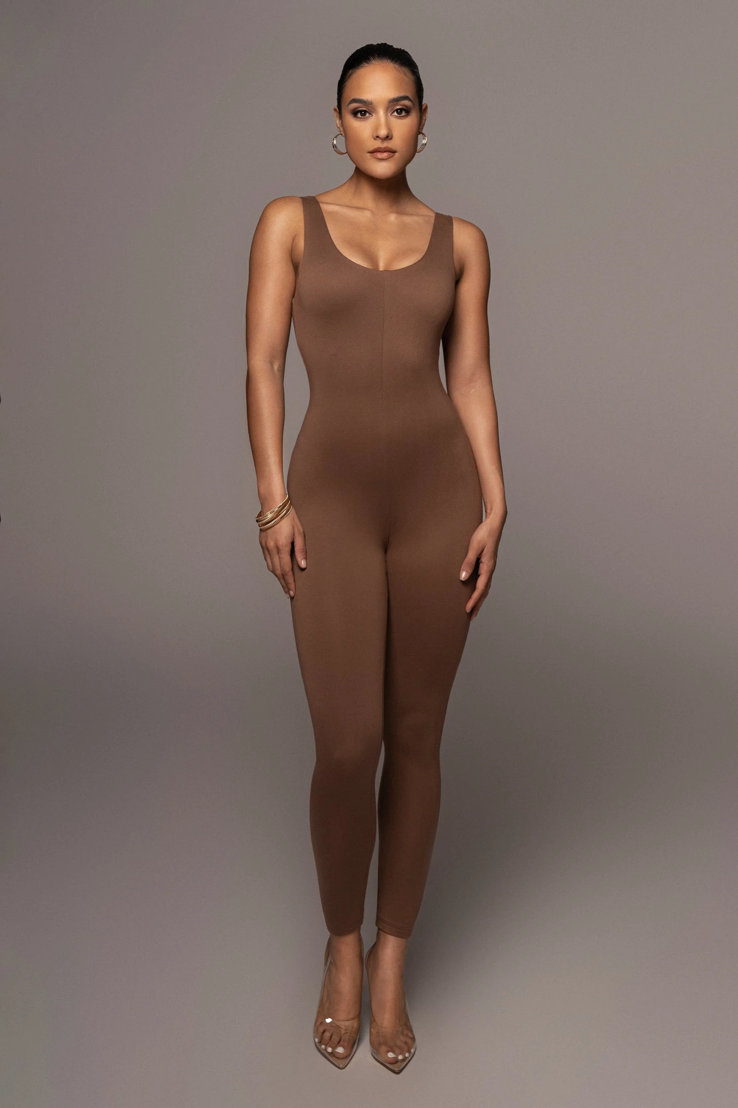 EXCLUSIVELY DESIGNED BY US FOR YOU. All eyes are on you when out in the PECAN ALO DOUBLE LAYER JUMPSUIT! This versatile, sleeveless jumpsuit features a body forming silhouette with a low scoop neck, tank shoulders, and skinny leg hems. Designed in smooth double lined jersey fabric for compression support. Style it as a layer or by itself, either way, your look will be irresistible! Stretchy.