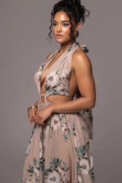 Step back and take in the beauty of our Purple Floral Nicoletta Chiffon Maxi Dress. The perfect cover up for your summer days is here. Achieve light and breezy style in this plunging maxi dress showcasing a lovely floral pattern with a halter neckline, a high front slit, and an elastic waist. The center of this maxi details a keyhole design with cut-out sides and back waist ties. Stretchy. Single Lined.