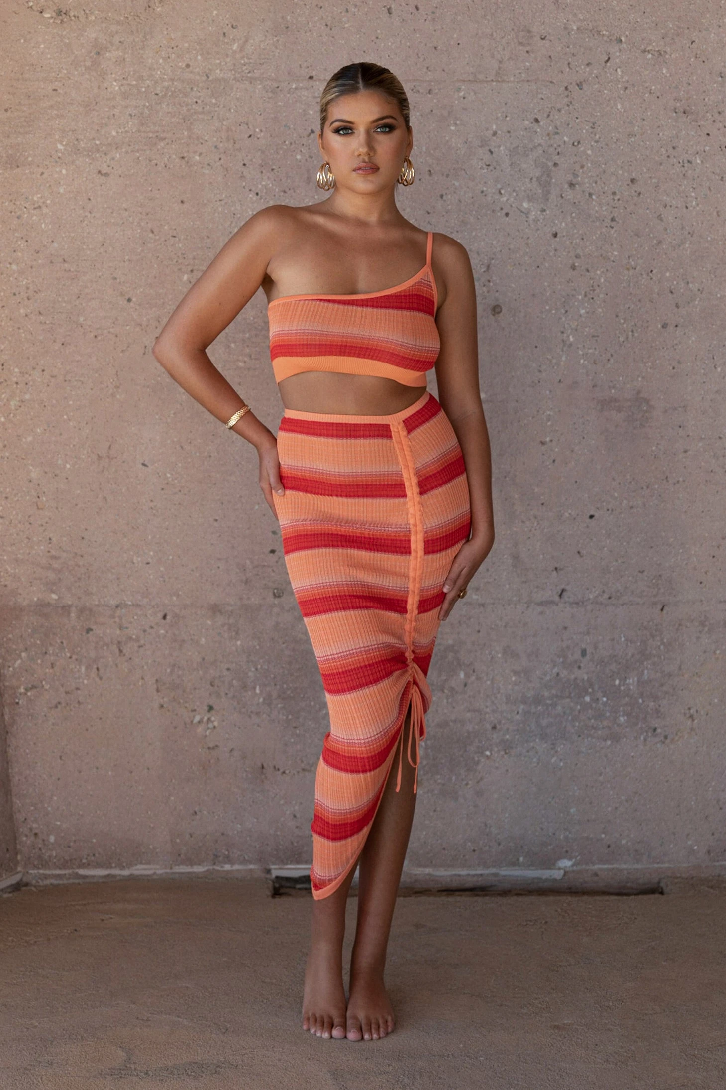 Head out for some fun in the sun with our Red Good Times Crop Top. This trendy lightweight top features a one shoulder neckline with an adjustable strap and cropped hem. A striped pattern throughout adds a playful element in vibrant hues. Pair with our