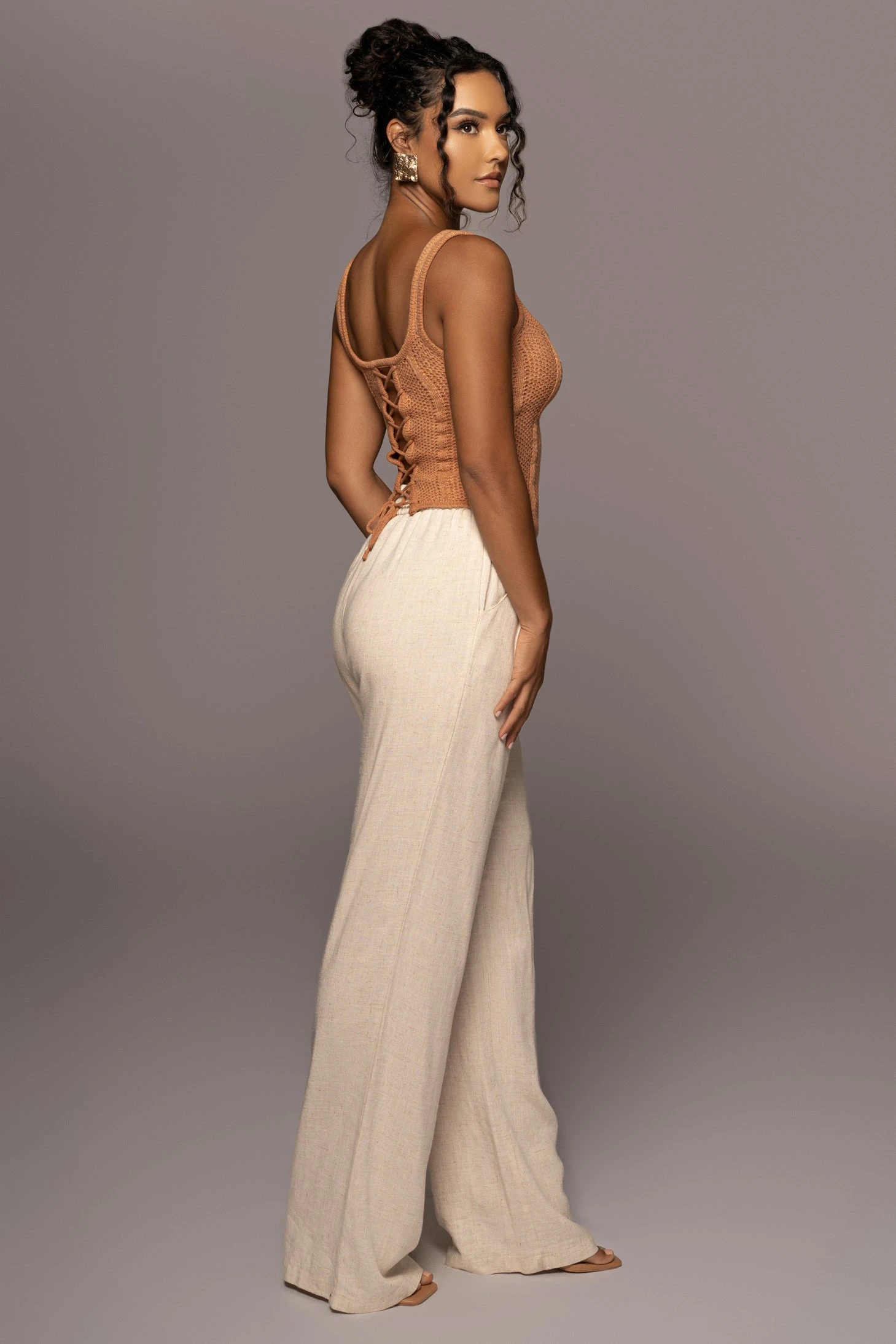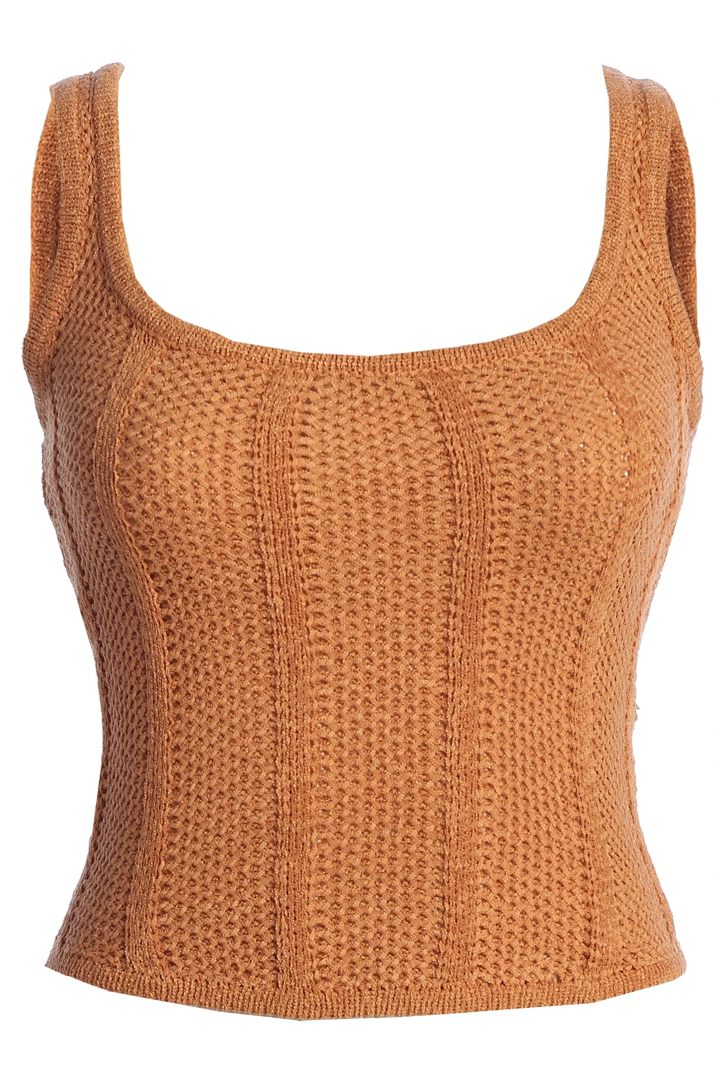 EXCLUSIVELY DESIGNED BY US FOR YOU. Set a coastal vibe with our RUST SHORE THING CROCHET TOP! This crochet knit top features a squared neckline with tank shoulders straps, a ribbed bodice, and back lace up ties. Pair with our