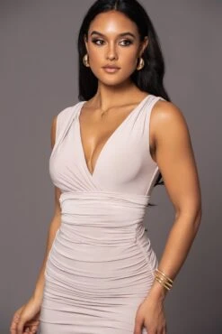 Wrapped to perfection in our Seashell Edge Of Romance Midi Dress. This stunning multi-tie bodycon dress comes with long straps that can be wrapped around your body in different ways to achieve different looks. Beautiful ruching throughout and a stylish side drape heighten the elegance of this occasion ready dress. Double lined with stretch.
