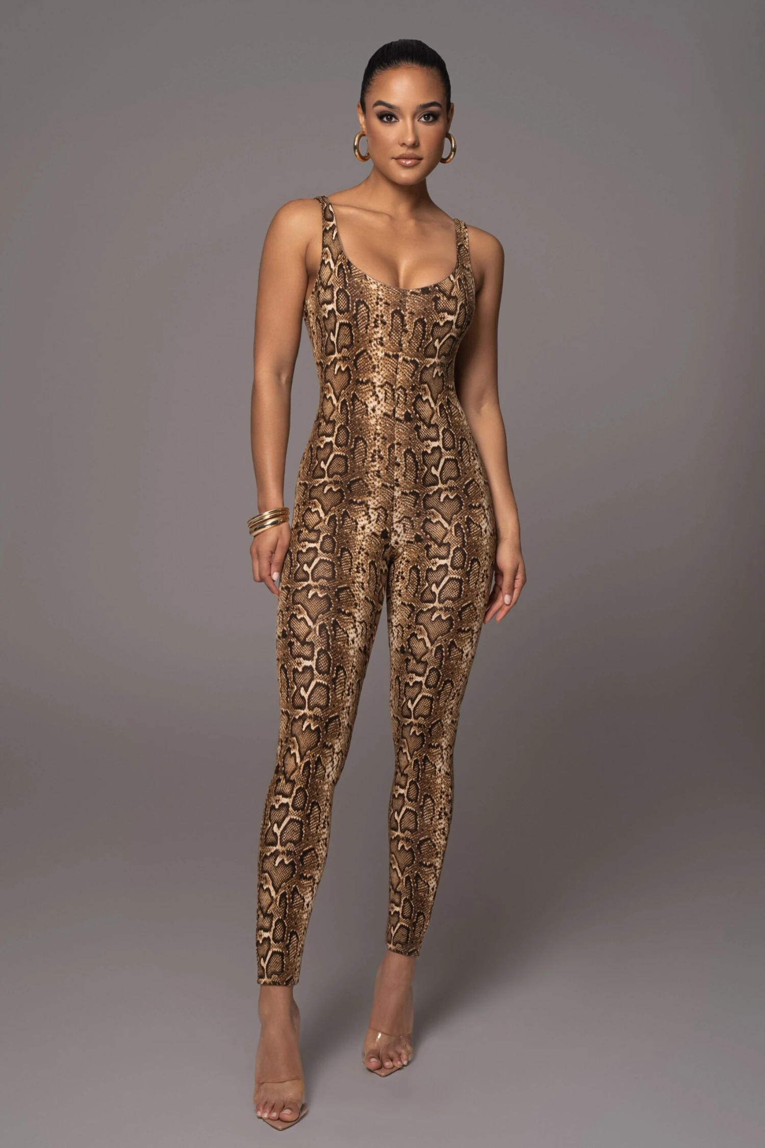 Make an unforgettable impression in the Snakeskin Wild Ones Tank Jumpsuit. This eye-catching jumpsuit features a snakeskin print, u-neckline and double lining for extra comfort. Its form-fitting silhouette and skinny hems flatter any body shape. Stretchy.