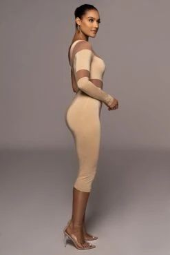 They’ll only have eyes for you when wearing the Tan Eyes For You Midi Dress. Designed in a captivating mix of mesh and soft jersey, this classy one shoulder midi dress features mesh panels in a modern asymmetrical pattern going across the front/back top waist. Stretchy. Double lined.