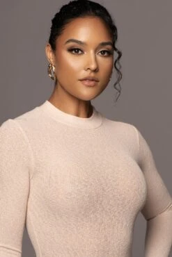 EXCLUSIVELY DESIGNED BY US FOR YOU. Our TAN KIMBER HIGH NECK BODYSUIT makes it all look easy! This essential long sleeve bodysuit is featured in micro ribbed fabric and comes with a classy high neck and a thong bottom with double snap closure. Own it in every shade! Breathable and stretchy.