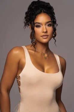 Embrace the summer season with confidence in our Tan Late Nights Midi Dress. Crafted from our signature double lined fabric, this fitted midi dress showcases a scoop neckline with a racerback cut and stylish lace ups bungee strings. Stretchy.