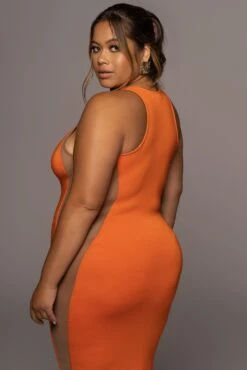 EXCLUSIVELY DESIGNED BY US FOR YOU. Both edgy and elegant! Our TANGERINE THE HILLS CONTRAST DRESS features a high neckline with sleeveless shoulders in a solid design with contrasting mesh panels on both sides from the top down to the bottom hem. Crafted in our double lined jersey material for smooth comfort and quality fit. Stretchy.