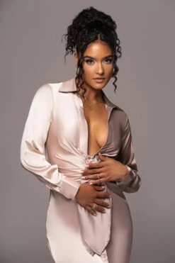 Look vibrant and stylish all summer in our Taupe Color Block Satin Midi Dress. Crafted with luxurious satin fabric, this lovely midi dress features a color block design in brown shades with a plunging neckline and stylish tie front. Minimal stretch. Buttoned cuffs.