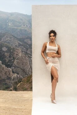 Our Taupe/White Jodie Ribbed Top is a one of kind rib-knit top that features a squared neckline with fixed shoulder straps that lead to a criss cross back and a cropped hem. Pair with our