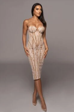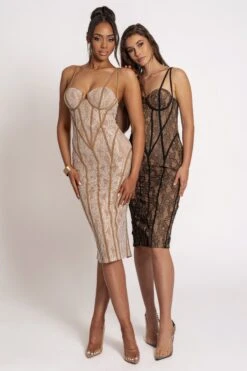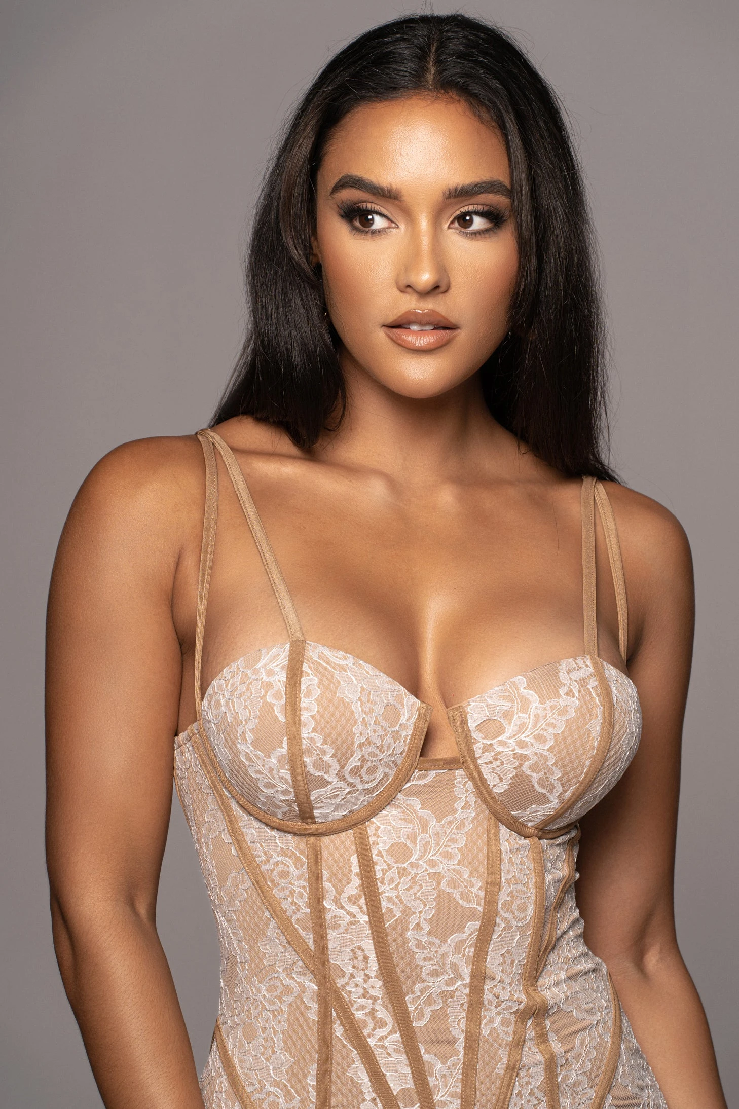 Lovely in lace with our White Katerina Lace Dress. This gorgeous curve-hugging dress features a sweetheart neckline with a bustier style bodice, and a back slit at the lower hem. Stunning piping detail throughout elevates the glamour of this midi length dress, complete with adjustable shoulder straps and back zipper for closure. Gold tone accents. Lined interior. Some stretch.